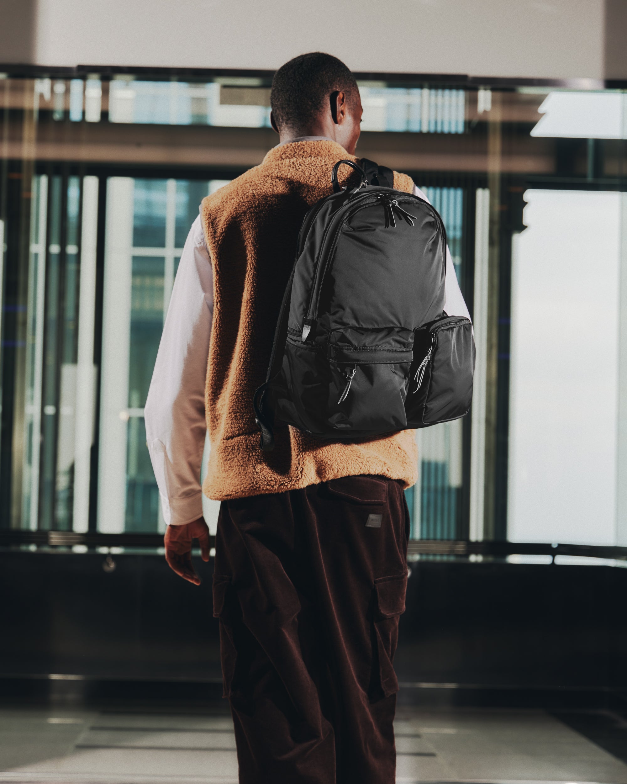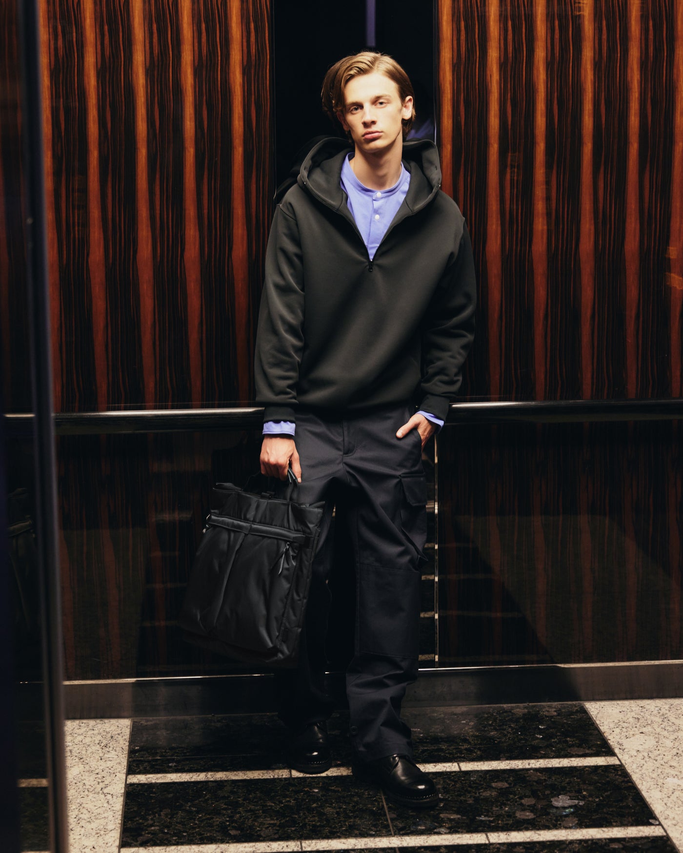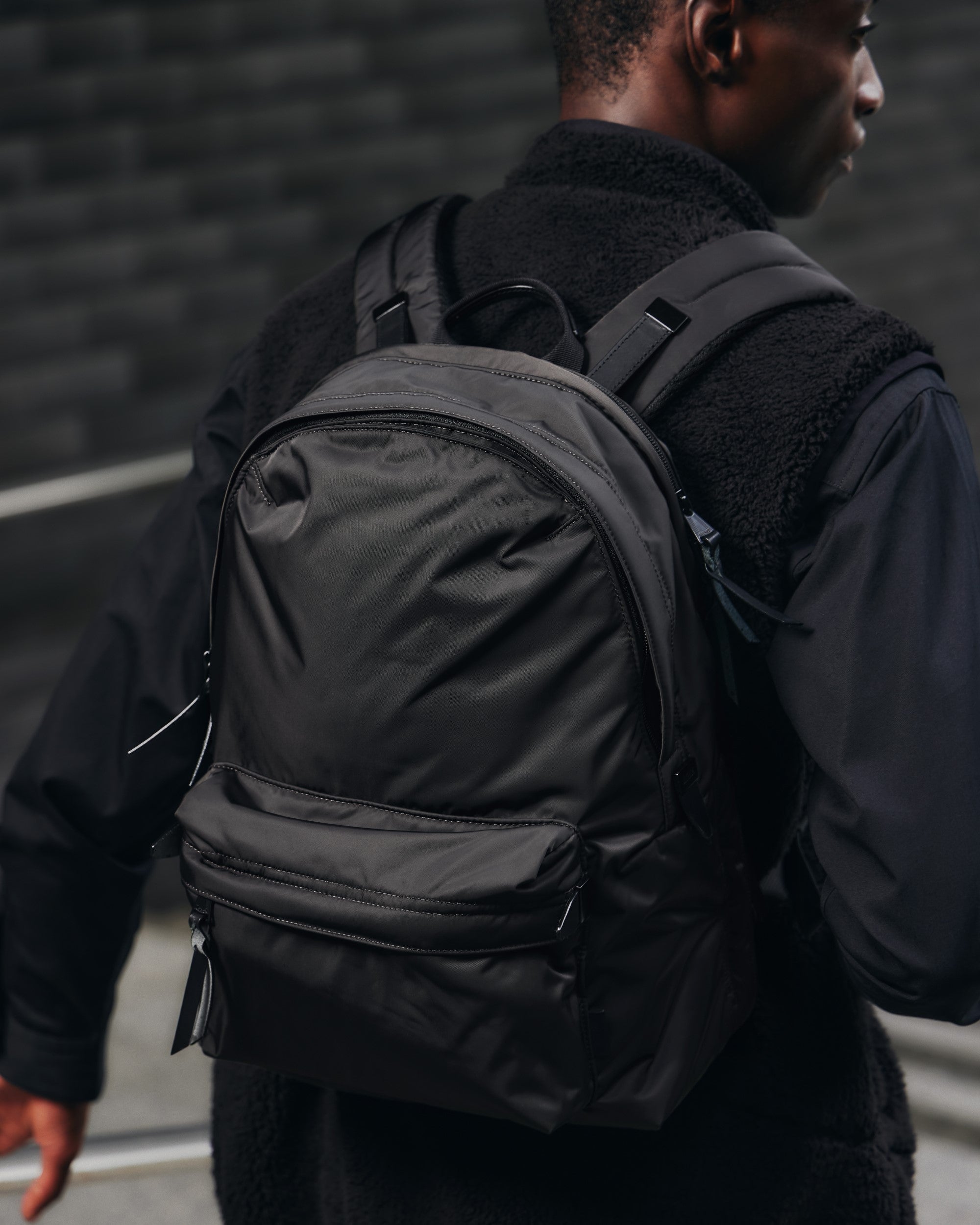 「DICROS ® SOLO」は、撥水性に優れる超高密度ポリエステル素材です。陰影感をもたらす独特な糸の光沢が、ナイロンのような潤いのある艶やかさを与えます。また、形態安定性に優れシワになりにくく、撥水性・耐久性も備えたハイスペック素材で、タフな使用にも対応します。